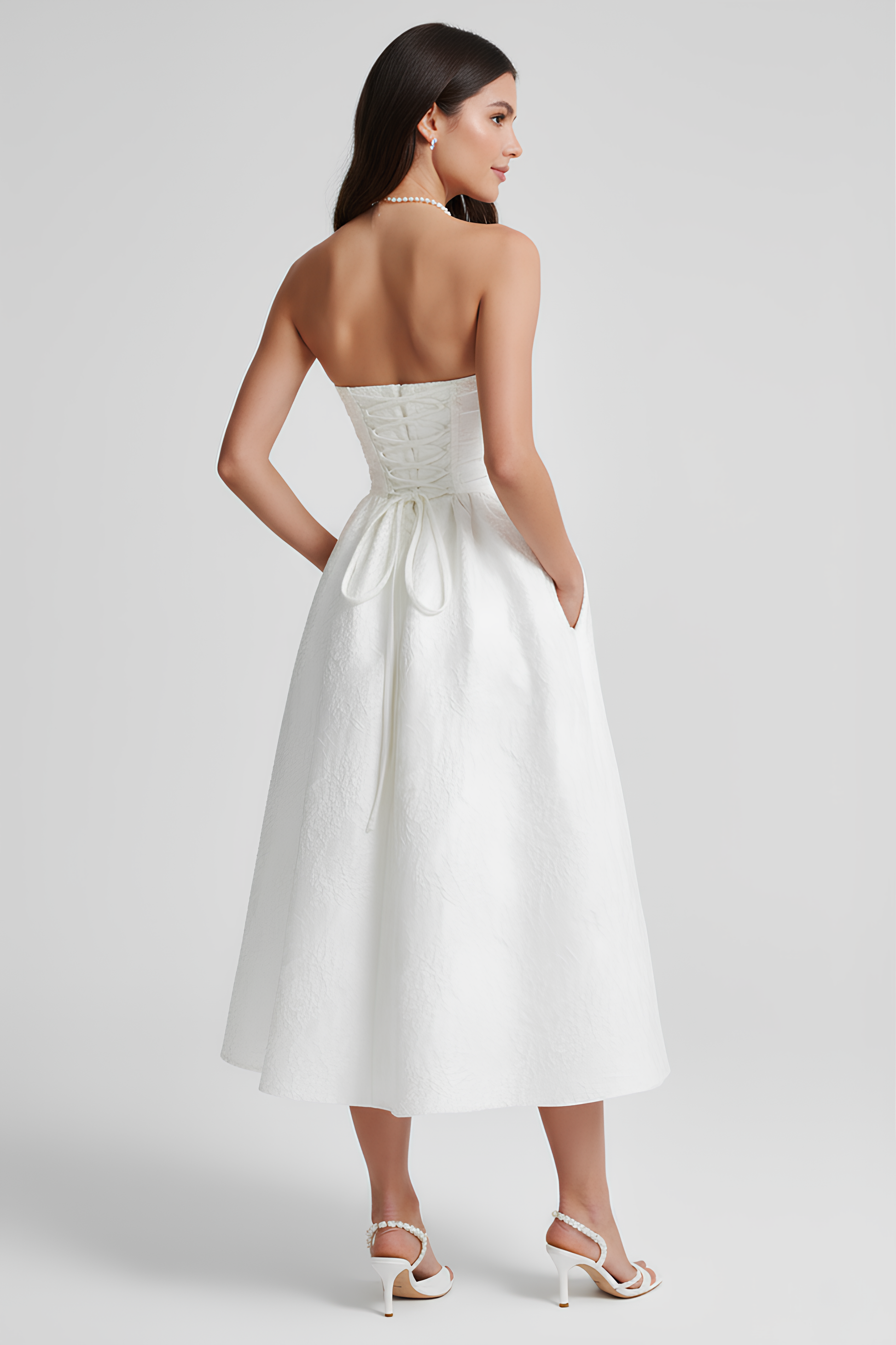 De Bustier Jurk Clarisse brengt elegantie met zijn lichte en vloeiende pasvorm. Met een taille-aanpassing accentueert het de jurk nog meer op het lichaam.