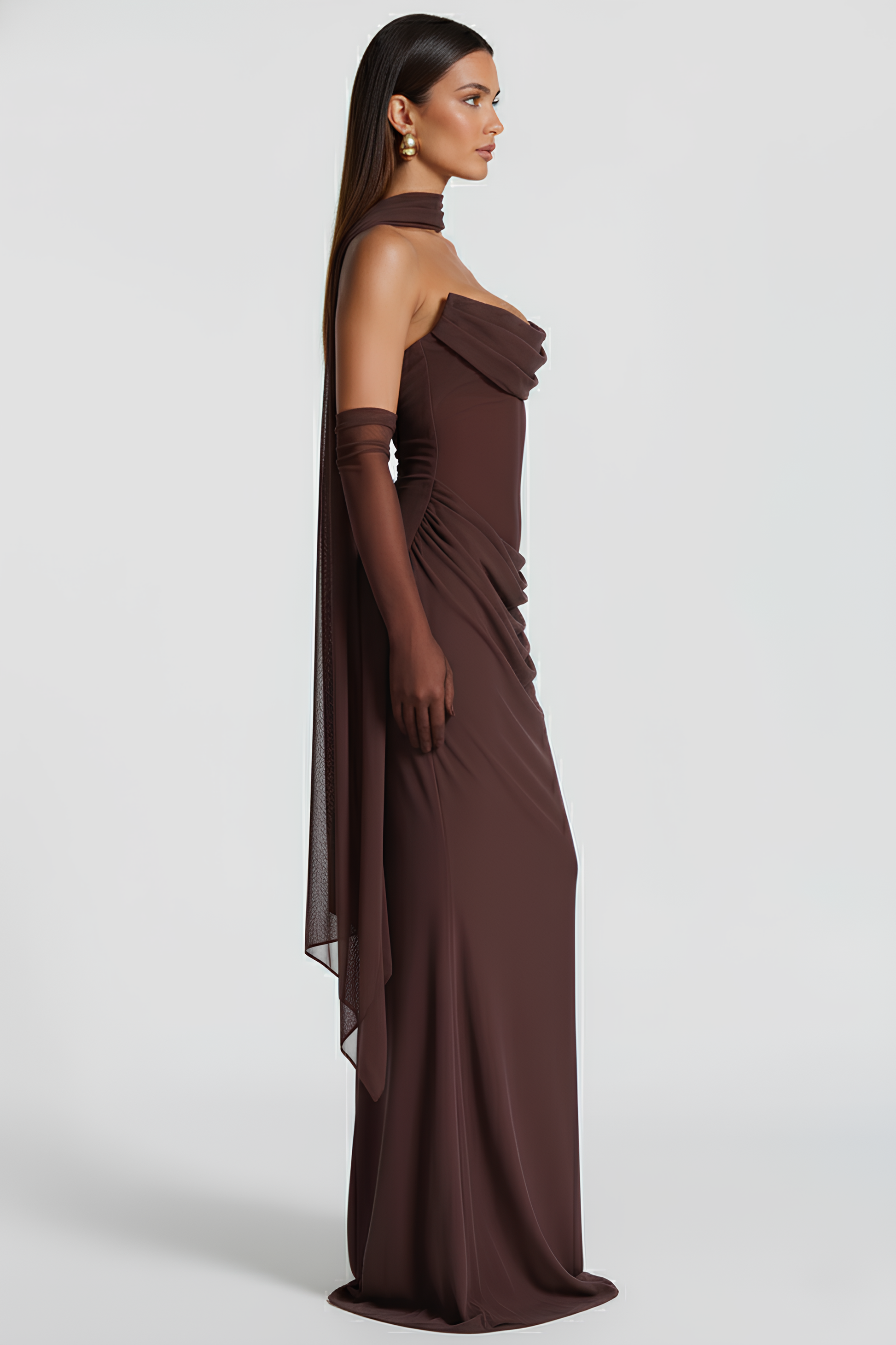 Aan de achterkant zorgt het corset-stijl strikdetail voor een betere pasvorm, waarbij de taille op een verfijnde manier wordt benadrukt. De zijplooien zorgen voor een vloeiende uitstraling, terwijl de tule sjaal extra beweging en charme toevoegt, die zowel los als om de nek kan worden gedragen. De lange tule handschoenen maken de look compleet en versterken de glamoureuze en krachtige esthetiek van het stuk.