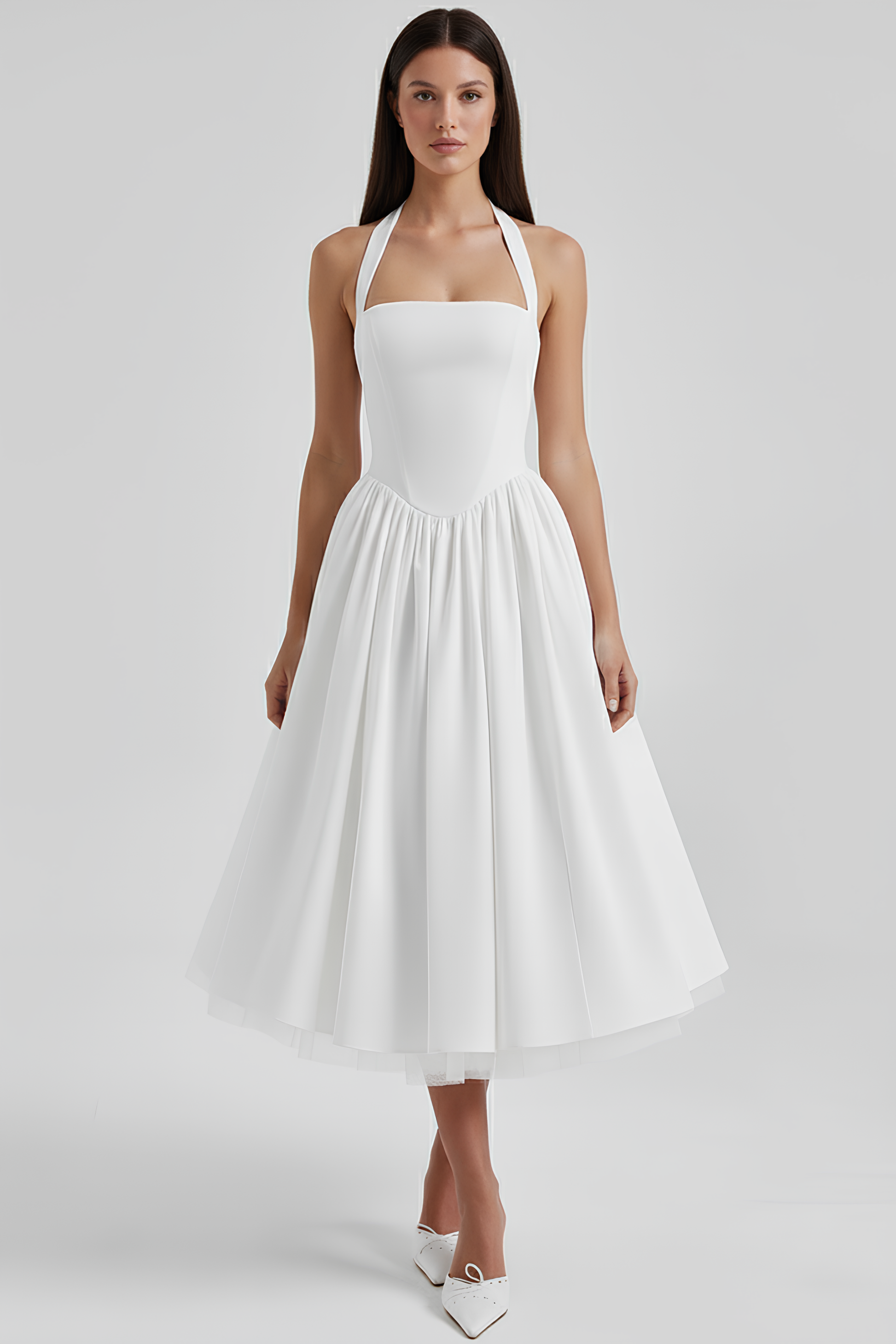 Midi Modelerende Jurk Anabel brengt elegantie met zijn lichte en vloeiende pasvorm. Met een taille-aanpassing, een voorkant die modelleert en een detail in de nek dat echt het verschil maakt.